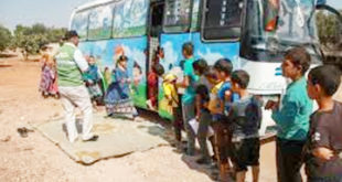 HAZANO, SYRIA: Near the village of Hazano in northwestern Syria, children come running through the olive groves every morning to meet the bus that brings the school to their improvised tented camp. Years of fighting and displacement in Idlib province have wrought chaos for the education of children, destroying schools …