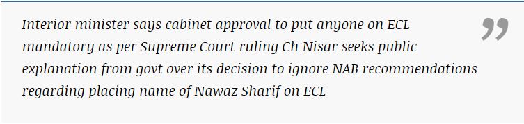 “As per a ruling by the Supreme Court of Pakistan, cabinet’s approval of all cases related to the ECL is mandatory,” he told reporters during an informal talk at the ministry. “The procedure to put anyone on the ECL should have been amended during the tenure of former interior minister Ch Nisar Ali Khan, but it was not done,” he said, adding that all cases from his [Ch Nisar] tenure will be sent to the federal cabinet for approval.