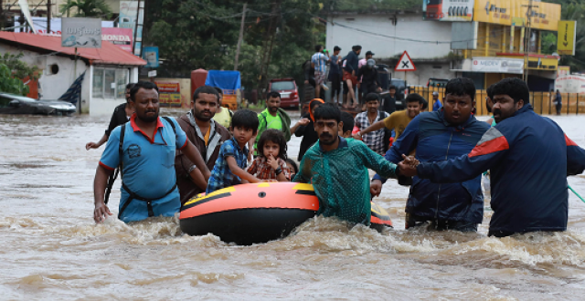 Indian volunteers and rescue personal evacuate local residents in a boat in a residential area at Aluva in Ernakulam district, in the Indian state of Kerala.
