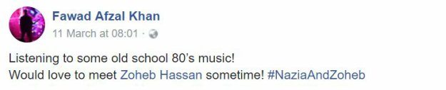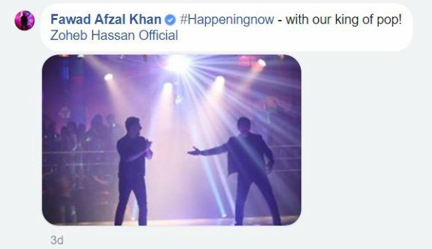Fawad soon shared a photo of the two performing together at the recent Pepsi Battle of the Bands together, enclosed with a caption, “Happening Now – With our king of pop! Zoheb Hassan.”