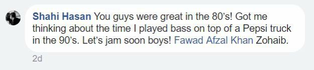 Also one of the judges at Pepsi Battle of the Bands, former Vital Signs guitarist, Shahi Hassan, asked if he could join the duo as well. Pointing out to Zoheb, he commented on Fawad’s post saying, “You guys were great in the 80s! Got me thinking about the time I played bass on top of a Pepsi truck in the 90s. Let’s jam soon boys!”