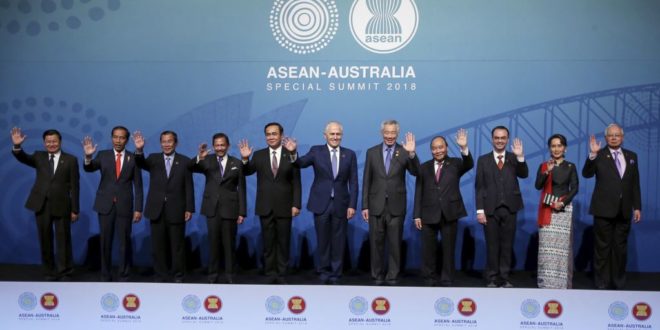 Leaders, from left to right, Prime Minister of Laos Thongloun Sisoulith, Indonesia’s President Joko Widodo, Cambodia’s Prime Minster Hun Sen, Brunei’s Sultan Hassanal Bolkiah, Thailand’s Prime Minister Prayuth Chanocha, Australia’s Prime Minister Malcolm Turnbull, Singapore’s Prime Minister Lee Hsien Loong, Vietnam’s Prime Minister Nguyen Xuan Phuc, Philippines’ Secretary of Foreign Affairs Alan Peter Cayetano, Myanmar’s leader Aung San Suu Kyi, and Malaysia’s Prime Minister Najib Razak, pose for a group photo at the Association of Southeast Asian Nations, ASEAN, special summit, in Sydney, Saturday, March 17, 2018. Australia is hosting leaders from the 10-country Association of Southeast Asian Nations during the 3-day special summit. (AP Photo/Rick Rycroft)